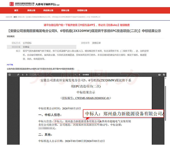 2026年3月13日,中國大唐集團有限公司“大唐電子商務(wù)平臺”公布中標結(jié)果:由鄭州鼎力新能源設(shè)備有限公司與淮南市超越電氣安裝有限責(zé)任公司組成的聯(lián)合體,正式中標...