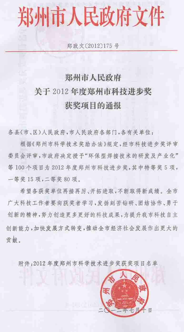 我公司煤泥回轉滾筒干燥系統(tǒng)項目被鄭州市科學技術局授予2012年度科技進步獎項二等獎獲獎榮譽證書。(圖)